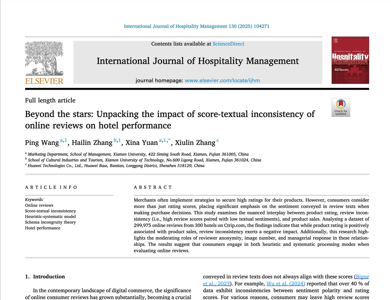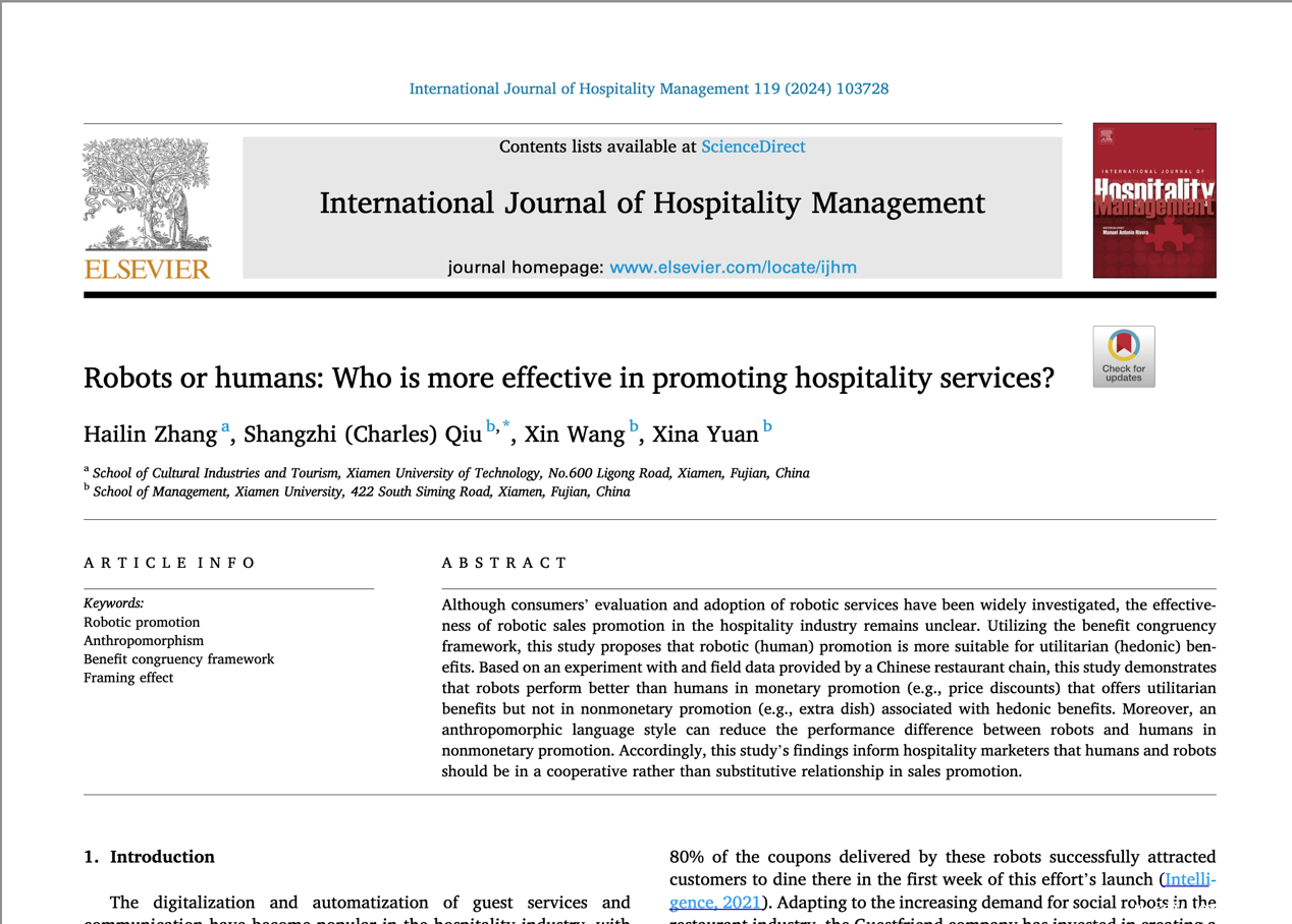 近日,我校文化产业与旅游学院张海林博士团队在国际顶刊International Journal of Hospitality Management发表了题为“Beyond the stars: Unpacking the impact of score-textual inconsistency of online reviews on hotel performance”的最新研究成果。这是张海林博士连续第二年在该顶级期刊发表高水平论文。