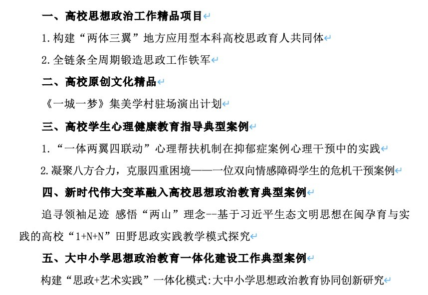 我校入选立项名单的7个项目包含高校思想政治工作精品项目2项、高校原创文化精品1项、高校学生心理健康教育指导典型案例2项、新时代伟大变革融入高校思想政治教育典型案例1项、大中小学思想政治教育一体化建设工作典型案例1项。据悉,我校1个项目被推荐参评教育部2025年度高校思想政治工作质量提升综合改革与精品建设项目。