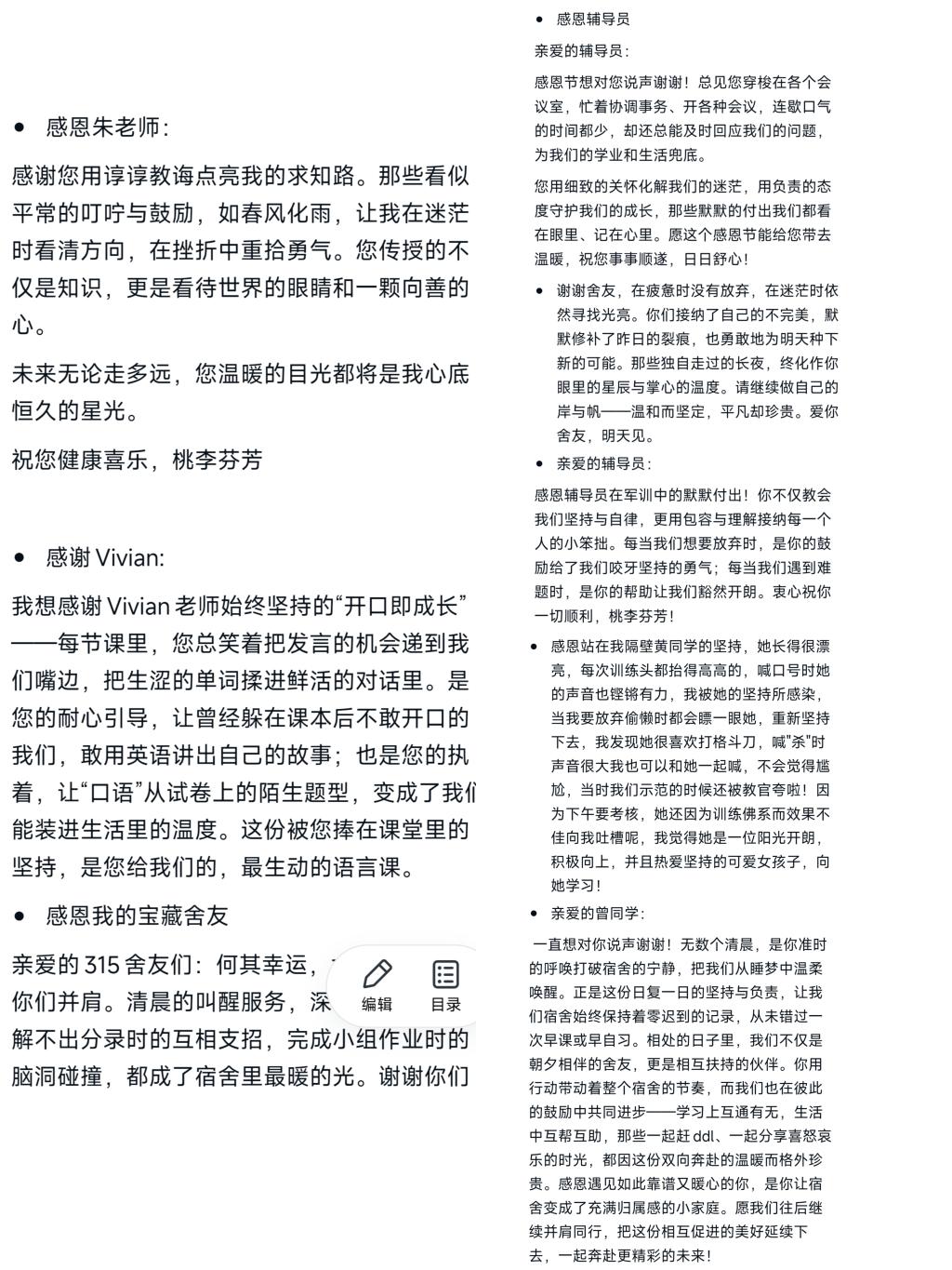 (“感恩回音墙”线上文档中,同学们写下真挚的感恩留言,温暖汇聚。)