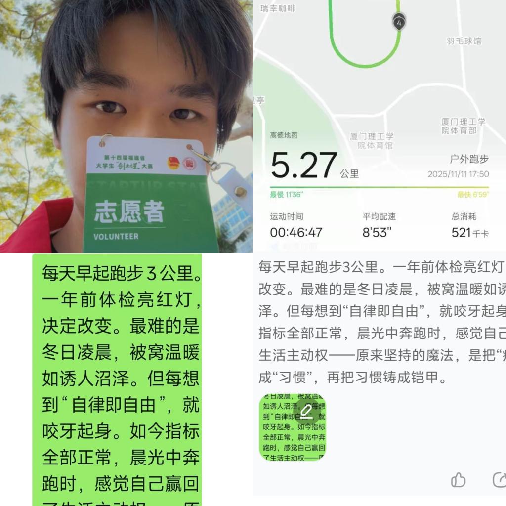 “照片收集”活动号召大家用镜头捕捉“正在坚持”的痕迹。无论是坚持英语打卡、坚持做课堂笔记,还是 坚持运动等,都被真实地记录下来。影像让抽象的努力变得具体可感,也让同学们在彼此的坚持中获得了共情与鼓舞。