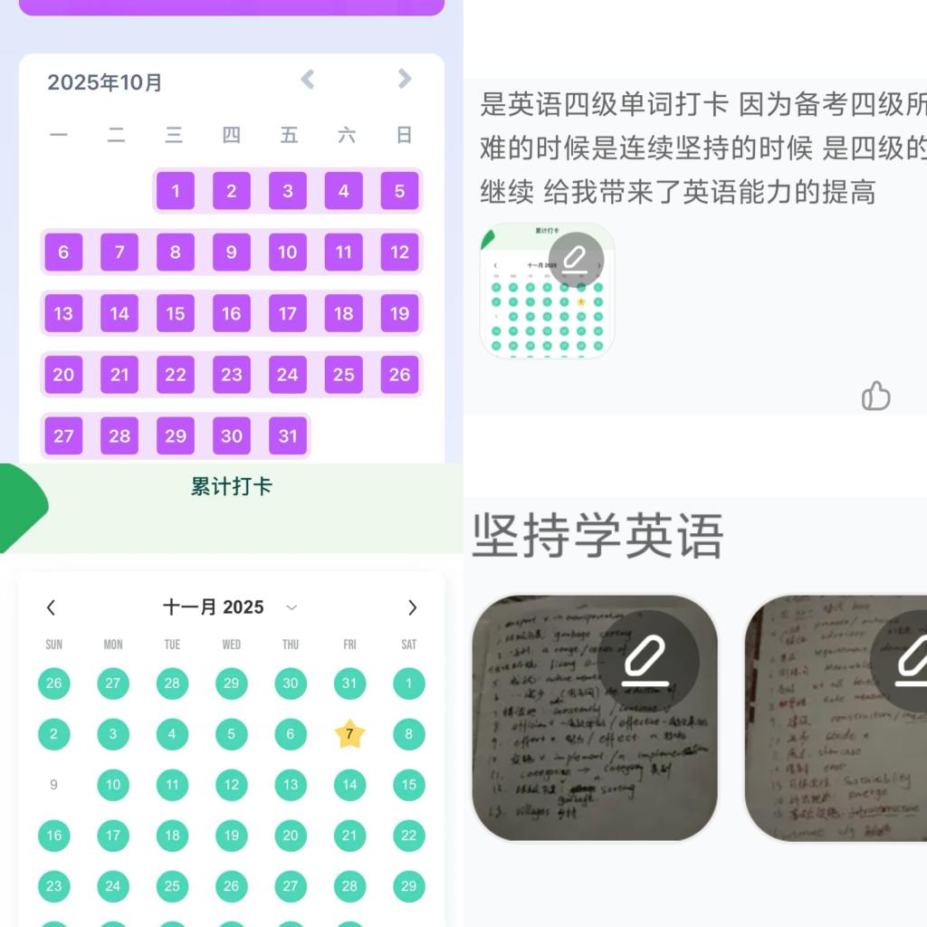 (“坚持”的日常注脚——同学们每日的英语学习打卡记录,累积着进步的轨迹)