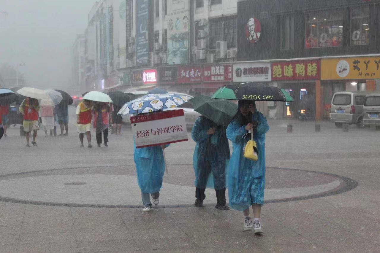 风雨交加,遍地积水,即使雨水和汗水将全身湿透,党员们仍然以热情、饱满的精神面貌投入到迎新服务当中,他们忙碌的脚步匆匆穿梭,他们冒着风雨和危险,不辞辛苦,他们通力协作,主动接过新生的行李,引导新生前往宿舍,同时热情地向新生介绍宿舍周边环境,为家长们解答疑惑。
