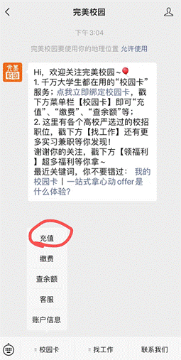 ① 关注完美校园微信公众号,点击“点我立即绑定校园卡”