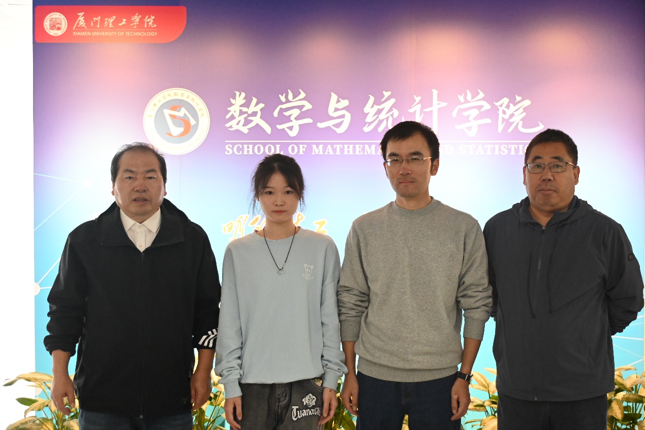 经管专业组一等奖获得者黄雅莘与指导教师欧启通、郭成、张一凡合影